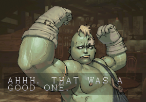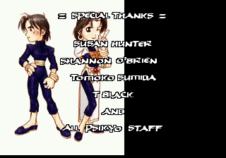 The only thing you get for whooping Carlos is a credit roll, which shows off various pieces of artwork (including Haiji beating Trigger and Carlos, implying he’s supposed to be the canon hero), and a few characters who look unfamiliar, perhaps hinting that Daraku Tenshi was supposed to be bigger than its end result. The game seems to give off an air of being unfinished, and as it turns out, there are some sprites and artwork buried among its code that gives evidence to its incompleteness. Four aborted character sprites could have brought the roster up to twelve: a tan shirtless brawler named Sid, a comical treasure hunter girl called Lapis, a red-suited criminal known as Snake, and the disturbing Jimmy, one of Carlos’ escaped experiments who looks like a completely nude albino with no definable naughty bits. More beta images reveal three alternate possible working titles: “Rubbin’ Out,” “A Blow For Freedom,” and “Gut Reaction.” There’s also a bit of cutscene artwork showing some plump bearded gangster grappling a tall old man by his tie, hinting that there would have been more to the plot than what little we’re given. No one can say if DT would have been more well-known if it had been given more of a chance to breathe and implement these cut items, but its end result has turned out adequate in spite of its edits.