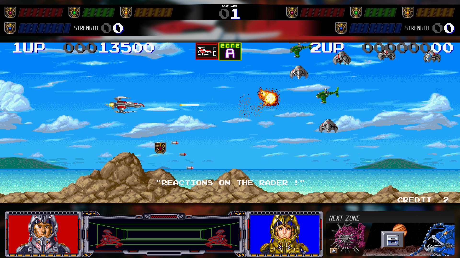 The Darius sequel. Also included are three version: the Japanese release, the overseas released known as Sagaia, which cuts out and shortens a number of levels (and also starts on a different first stage), and a revised Sagaia which just has a different level set but also cuts things out. It’s believed that the revised Sagaia was not actually distributed anywhere, and it’s not emulated in MAME, leaving it exclusive to this release, though it’s still a compromised version of the game so it’s only interesting from a historical perspective.