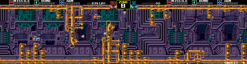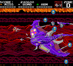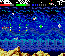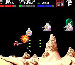 Yes, fish. Not regular, aquatic fish, but robotic fish with lasers equipped to their fins, giant metal teeth, and missiles firing from their gills. Not just fish, either. There are squid, snails, lobsters, octopi, sharks, and all manner of sea creatures, too. The plot is about the people of the planet Darius, who are being terrorized by the Belsar (sometimes spelled “Belser”) empire and their fleet of oceanic robots. Only the heroic pilots Proco and Tiat (which, when pieced together, is “Taito Corp” backwards) can save the day. The constant star of the Darius series is the Silver Hawk ship. Much like Gradius, it has a primary, forward firing weapon, along with bombs that can be used to attack vertically, and a shield.