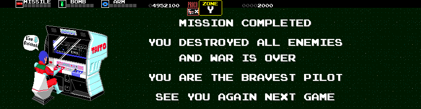 The music, however, is excellent. Composed by Hisayoshi “OGR” Ogura, it’s one of Taito’s first great soundtracks to come from Zuntata, the company’s in-house band. The most memorable theme is the first level song, “Captain Neo”, which was borrowed from a previous Taito shooter, Metal Soldier Isaac II.