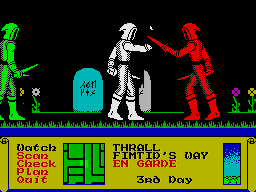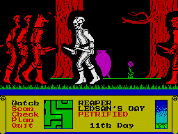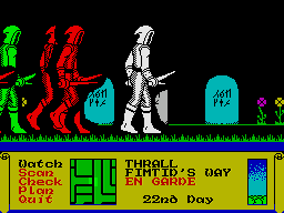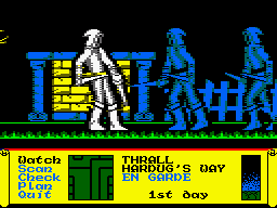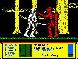 While Dark Sceptre does tend to get pretty monotonous, the excellent graphics and sound are engrossing enough to keep you involved. All characters are enormous animated sprites, a feature that few other ZX Spectrum games even attempted. Movements are incredibly smooth, recalling Tir Na Nog’s walking man, and battles are entertaining to watch thanks to the variety of attack motions. Characters will swing their swords and move away from attackers if they’re losing a battle, and it’s always satisfying to see your character get the final strike. The sounds are almost as great. During battle, the clashing swords are accompanied by clanking noises, while any character’s death lets out a cool digitized grunt. There’s also a short majestic theme that plays whenever a session starts or ends, a decent set of four channel chords that brings a lot of pomp to the game. This same theme also plays whenever an enemy is recruited, but this becomes frustrating since there’s no indication of which unit has joined you, forcing you to flip through your dozens of units to eventually find your new man. Still, everything feels very sophisticated for a simple 48K Spectrum title, and it’s clear that the extra development time was well spent.