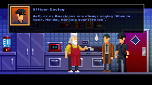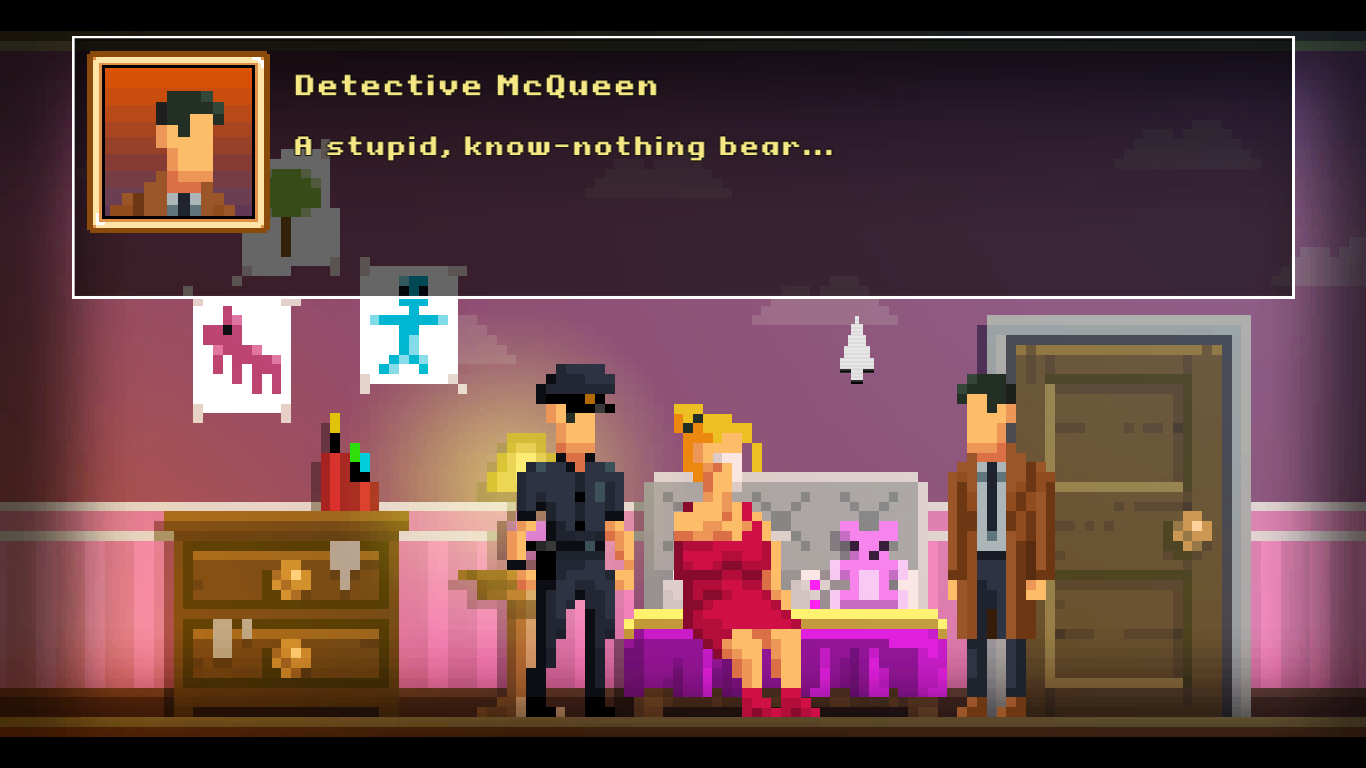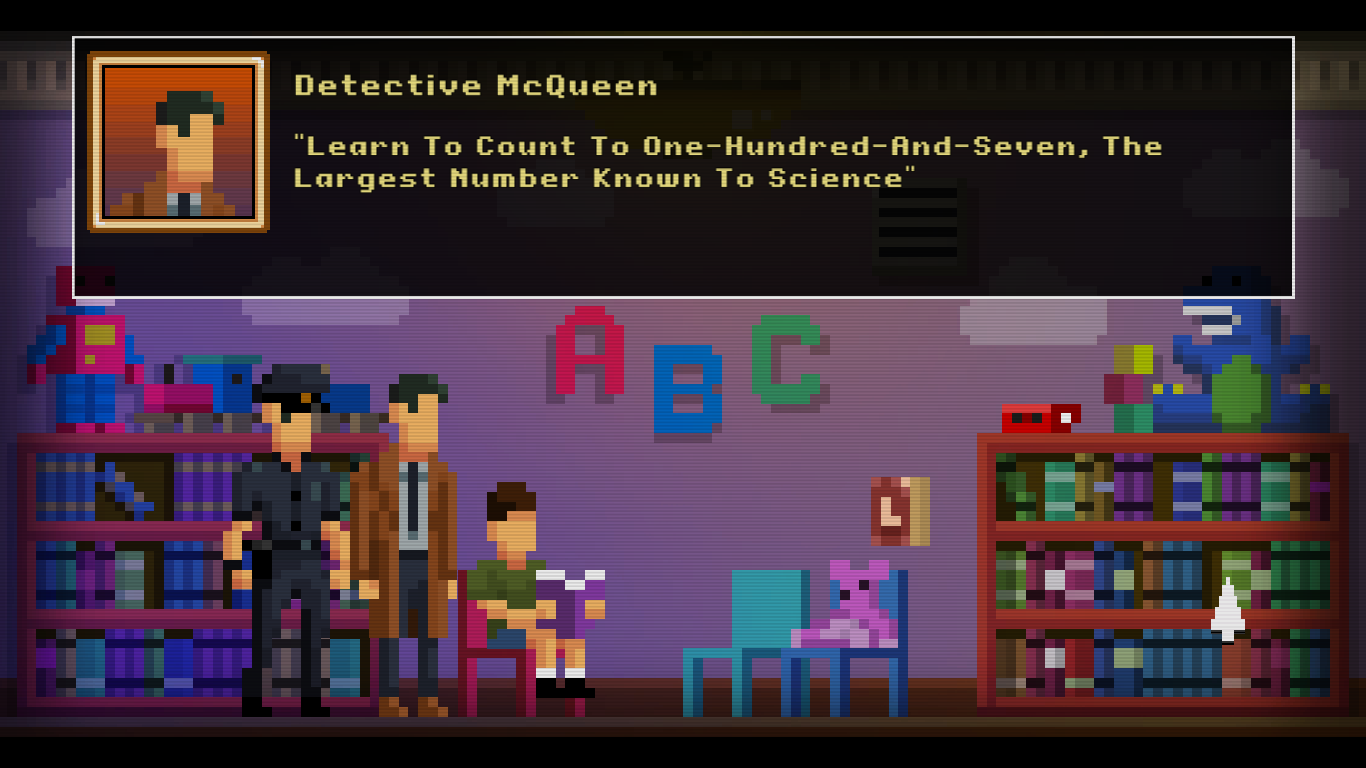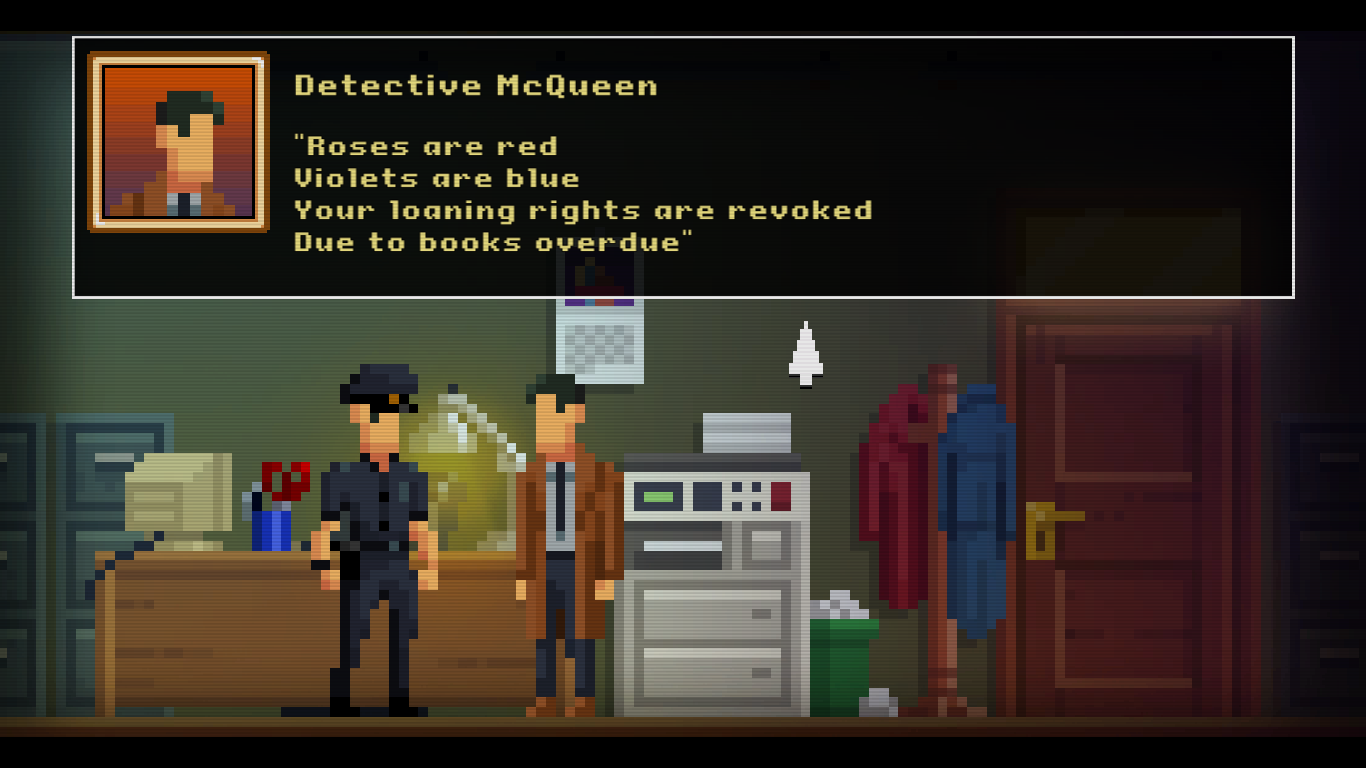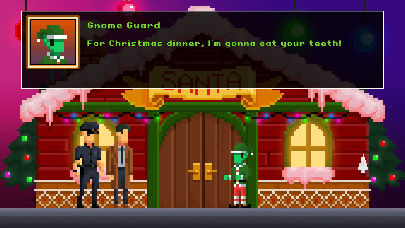 What makes Darkside Detective something worth investing in as a franchise, with a second game currently in development thanks to Kickstarter, is those later episodes. They become longer and more complex in their design, which does weaken the pacing of jokes, but they make up for it with stronger character dynamics. McQueen and Dooley grow a fun back and forth that makes them feel like equals, and the supporting cast gets used in a lot more fun ways, especially in the case where the duo have to save Christmas. Some puzzles are a bit much at times, relying on trying a ton of different options until you manage to break through out of sheer frustration, but the episodes are still relatively on the short side to keep it from being a game killer.