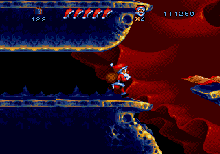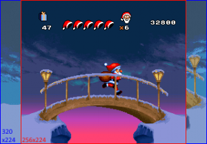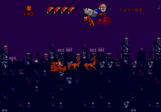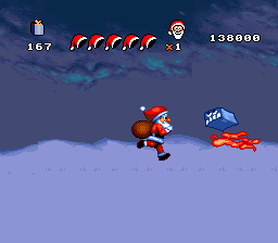 Defeating them leaves behind presents, which you can grab and deliver to children in bonus stages after every boss fight. These have no real purpose beyond giving you extra points, but they make for a nice change of pace. Other types of presents can also be found within the stage, either releasing trapped elves or giving you pickups such as Santa caps that restore your health, extra lives and checkpoint bells.