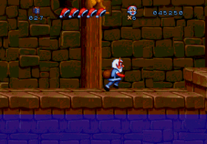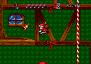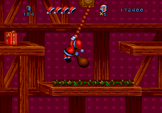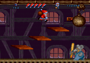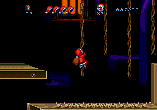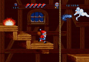 Daze Before Christmas is a platformer where your goal is to reach the end of the stage, which is indicated with a shining star most of the time. You’re able to run, jump, duck, climb up objects, and swing from ropes to get around, and you can take out rogue toys with projectile magic or by jumping on them (though you have to press the jump button while in the air, similar to Castle of Illusion).