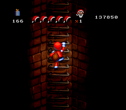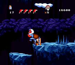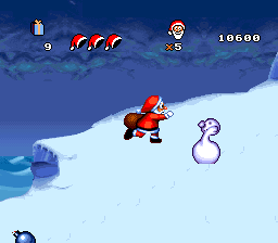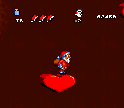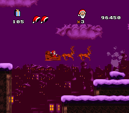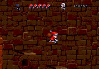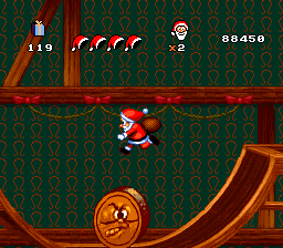 Daze Before Christmas is quite easy, with mostly straightforward linear levels, bosses that can be figured out and beaten quickly, and even unlimited continues at your disposal. Some stages can be a little tougher, forcing you to escape rising water or navigate a maze-like layout, but it’s otherwise a fairly breezy experience. The only big hurdle comes from how you only receive passwords after beating a boss every few levels, meaning you’ll have to beat a bunch of them in one go if you want to retain some progress. (Inputting the passwords is rather annoying, as you have to scroll through every letter and number individually by mashing a button to go forwards or backwards.)