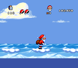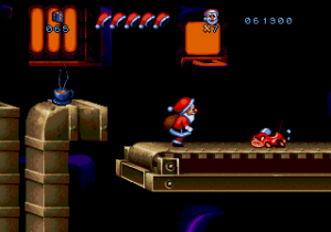 But it is a port, and one that at first glance seems practically identical to the original. Because both versions were developed in parallel, with any progress in one version being programmed over to the other, they share the same level designs and most of the graphics (apart from differences in color depth and a handful of redrawn backgrounds). The soundtrack has received a few changes, utilizing the same tunes but rearranged with new instruments and often in different keys. Some arrangements are identical while others go in new directions, like the much peppier take on the Toy Factory theme. It creates a different vibe, but it works equally well within the game and serves as a nice reinterpretation of the original music.