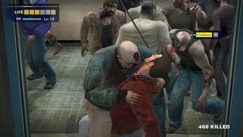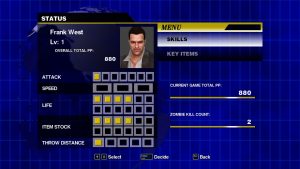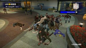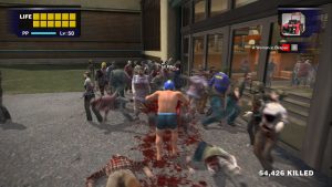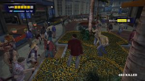 The game plays like an aged, bare bones beat-em-up (not unlike a more modern Yakuza game in a lot of ways), and lacks a lot of modern quality of life conveniences (Frank can’t “sprint”, duck behind walls or cover when getting shot at, and dodge rolling is an unlocked skill), but plenty of these systems hadn’t been made or mass adopted at the time. At its core, fighting zombies is simple and, if bare handed, Frank can pretty much only punch until he unlocks more useful skills like jump kicking or karate chopping. The real draw though is the wide array of objects and weapons for Frank to arm himself with. Players can freely pick up a large variety of objects off the ground (everything from tables and umbrellas to guitars, soccer balls, cleavers, frying pans, etc), and it effectively turns every shop in the mall into a weapon store, and every dire situation into an impromptu loot-a-thon.