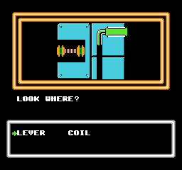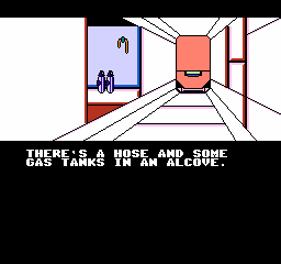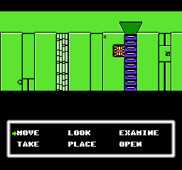 Dead Zone is an adventure game in which you must solve navigational and inventory-based puzzles to progress to the next area. You utilize a command menu which presents various ways of observing and interacting with the environment, such as moving around, examining noteworthy parts of a room, using and taking items, and more. There are also context sensitive actions that appear depending on where you are, hinting at what you’ll need to do in that specific area.