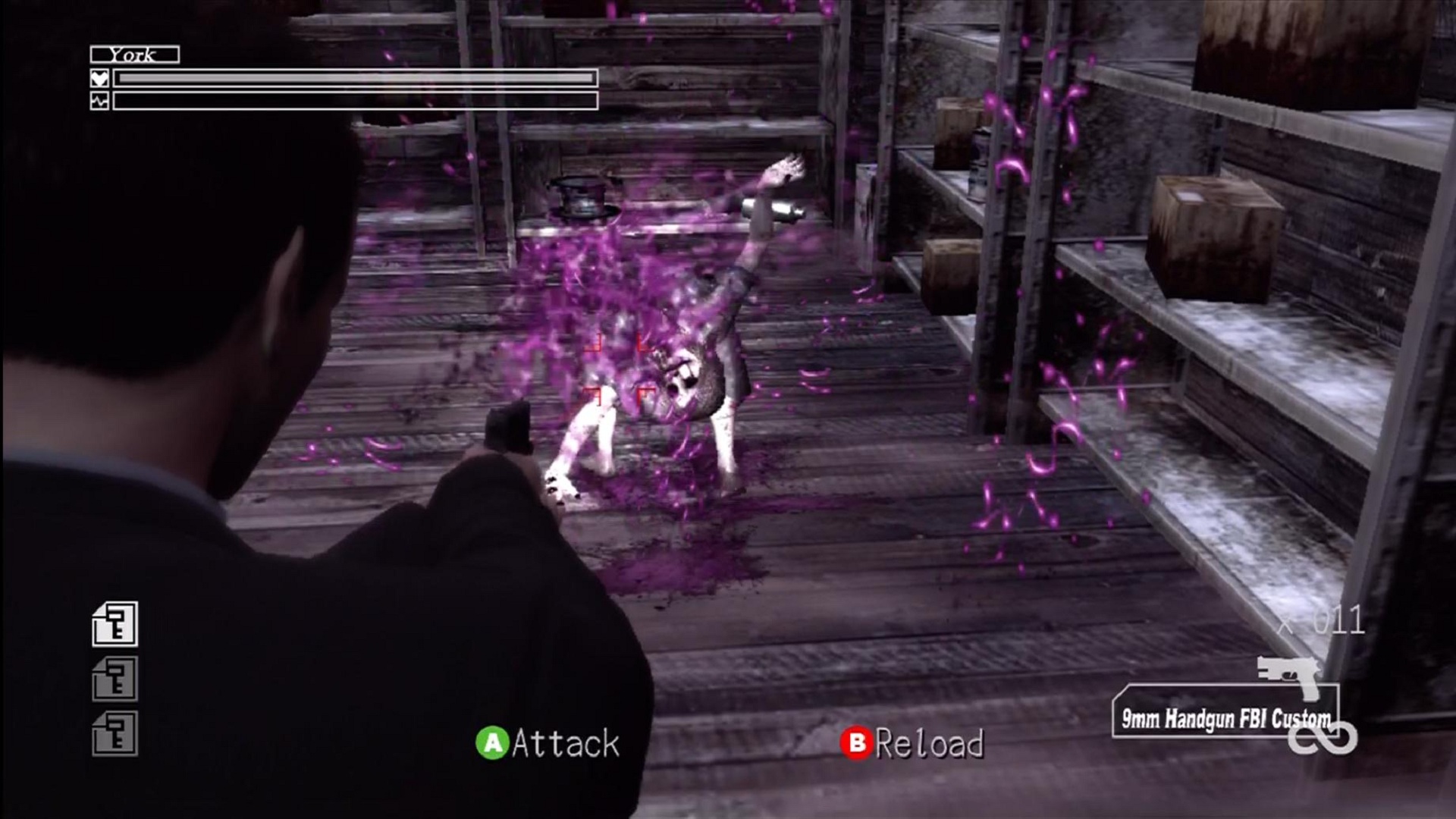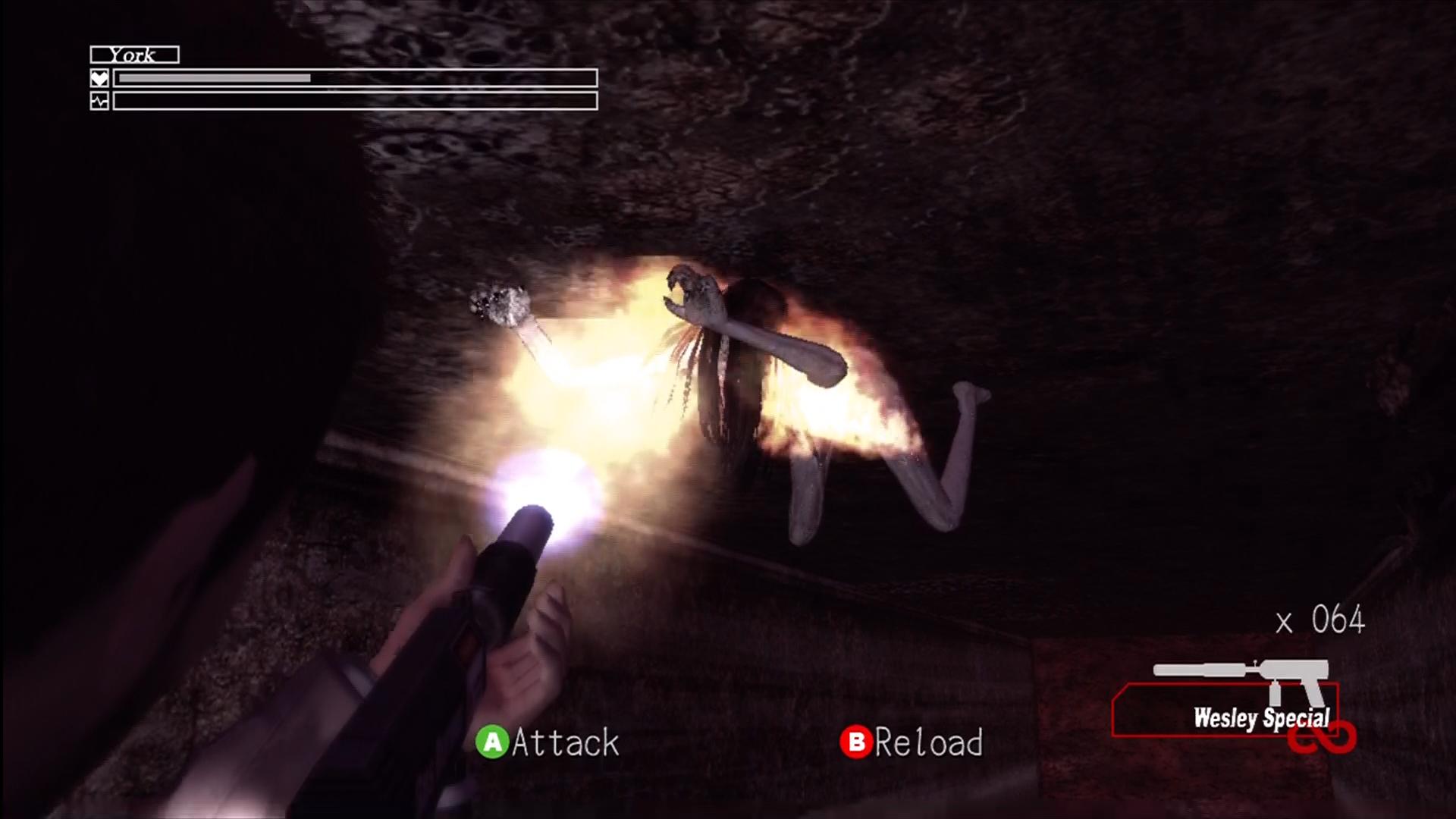 Firing weapons makes the camera go into a Resident Evil 4 / 5 over-the-shoulder view with York on the left. Weapons either fall into gun or melee categories, but a plethora are available. Finishing sidequests rewards you with the best weapons in the game including weapons with infinite ammo, a rocket launcher and flamethrower. York’s default weapon, the 9mm FBI Custom Handgun will suffice for an Easy mode playthrough, but those looking to finish the Normal and Hard modes should consider some of the sidequests as Crawling Shadows can be troublesome. In most situations, pacifists can make York hold his breath which makes it much harder for regular Shadows to spot him. Combat is far from perfect in Deadly Premonition, perhaps even to the extent that it’s the game’s greatest downfall. However, if you are used to the awkward controls found in most of the previous generation’s survival horror games then you will get by just fine.