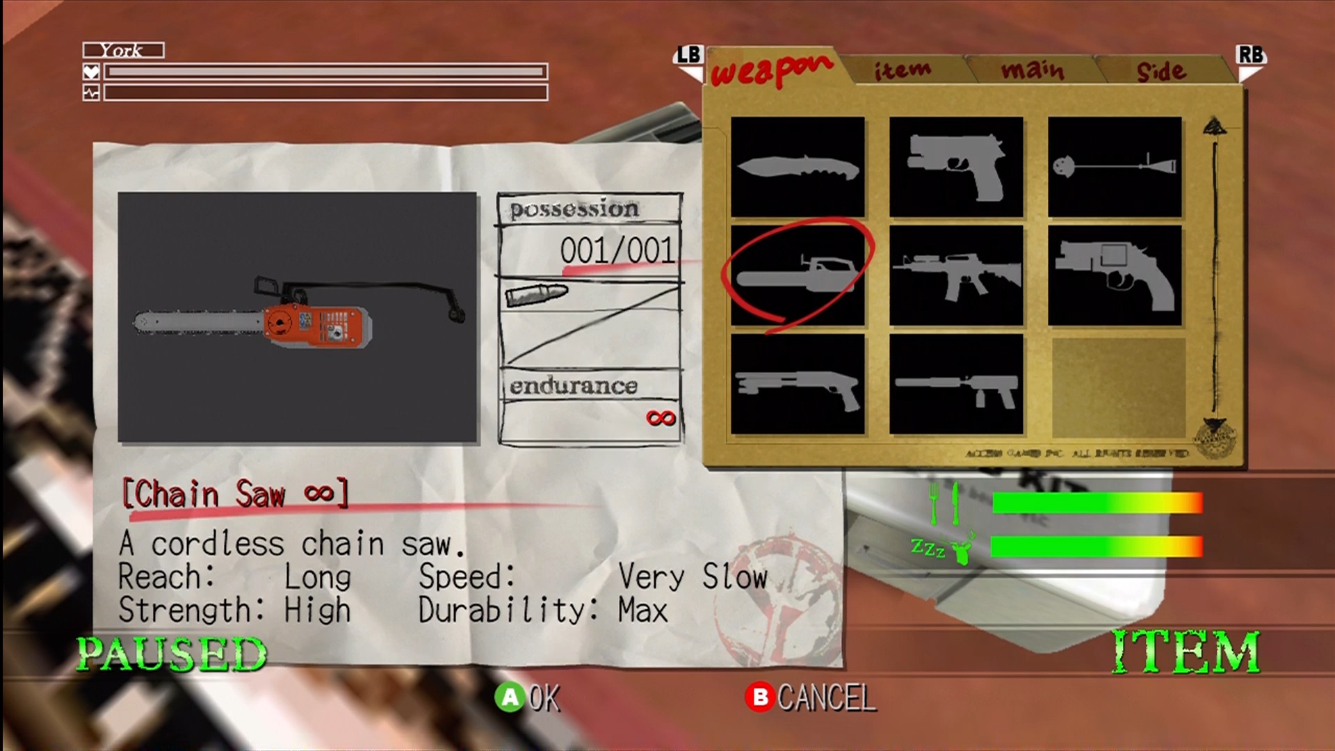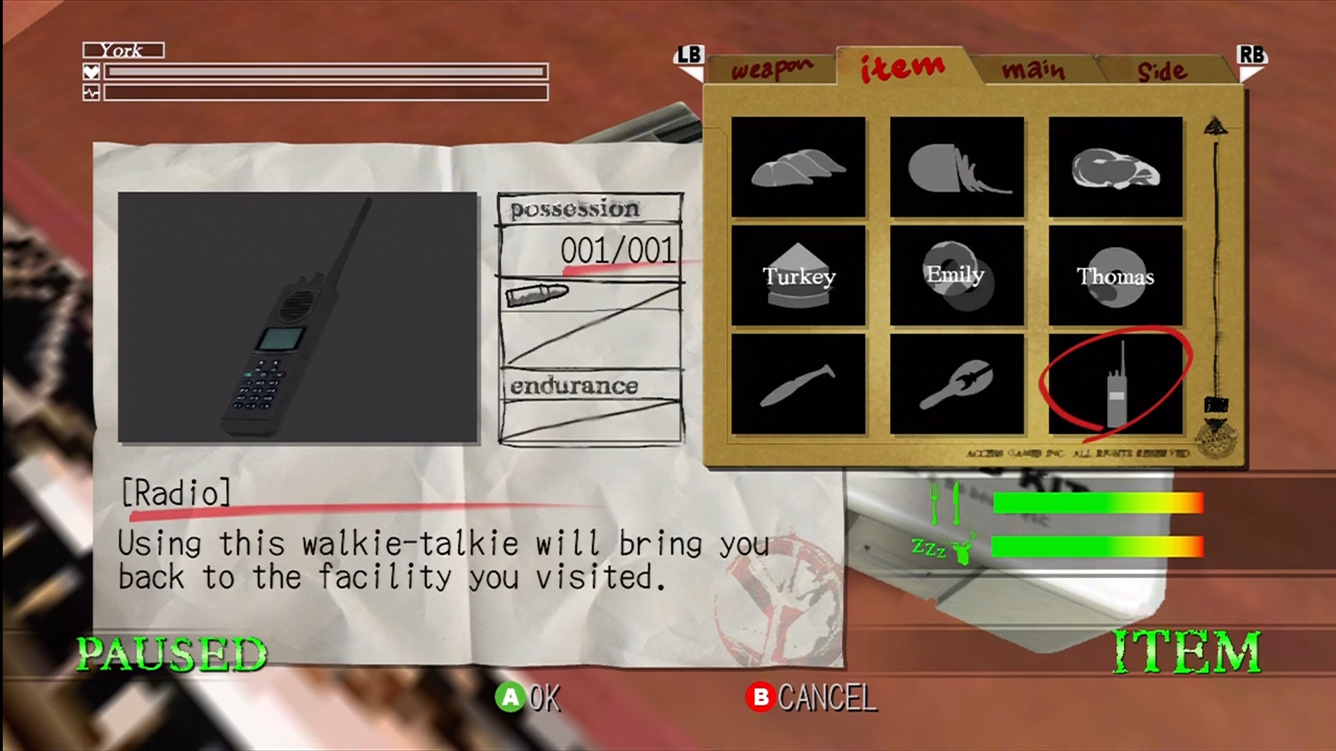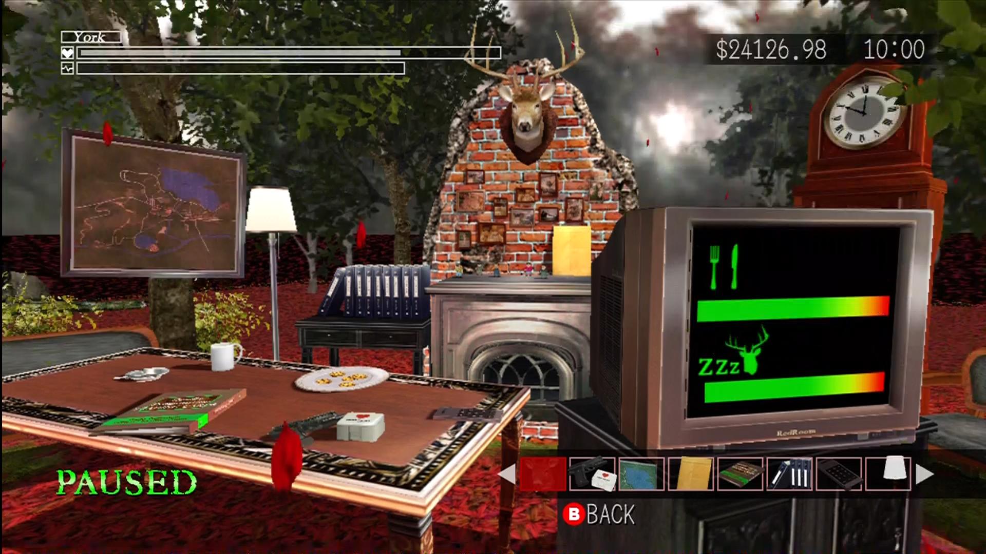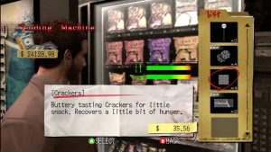When playing Deadly Premonition, there are several meters that need to be monitored. The most obvious and important meters the player needs to be aware of are York’s health, pulse rate, hunger and sleep levels. First-Aid Kits come in three sizes and are the most obvious way to restore York’s health when he is hurt. York’s pulse rate goes up when he is running, using Auto-Lock in combat, holding his breath, hiding, or using the siren boost in the patrol car. This is recovered either by ceasing to do these activities or, in the worst case scenario, using the “Stabilizer” item which will instantly return you to normal as well as keep you calmer than usual for a while. Hunger is satiated by eating any of the treats hidden around Greenvale such as cookies, onions and cans of pickles. Thomas also provides a free hearty lunch at the Sheriff’s Department each day which should not be missed in terms of both its convenience and the amusing conversations that ensue. Meanwhile, sleeping every so often is also a necessity. Coffee can give you a boost for a while, but it won’t last forever. Not maintaining these levels properly will cause your health to deplete over time. Whilst not nearly as important, York’s suits also require dry cleaning every few days. Not doing so will lead to York becoming a “Stinky Agent” and having flies fly around him in perfect circles. This causes no harm and is certainly entertaining for a while, but it gets old fast.