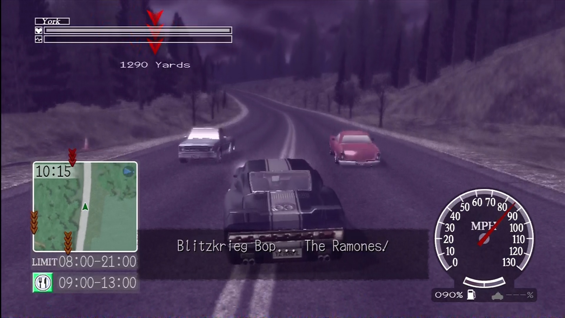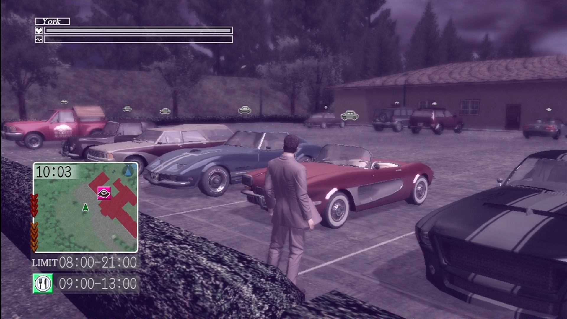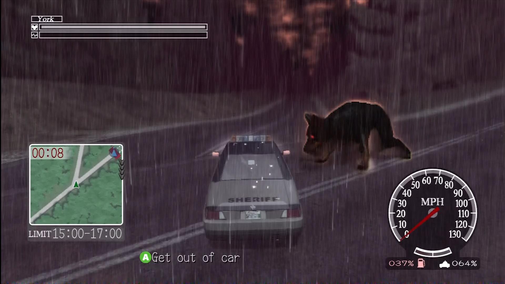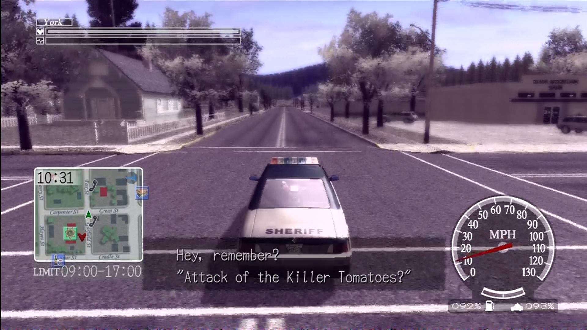 Near the start of the game, York receives a Master Key to every police squad car and SUV in the city. These cars can use siren boosts, although they raise York’s pulse rate. Peculiarly enough, as the story progresses, the option to buy many of the townsfolk’s cars opens up. Each vehicle has a different top speed, handling and brake power. Strangely for a game with such a limited soundtrack, almost every car has a different theme song of its own. Every car that is unlocked over the course of the game is stored in the Grand Deer Hotel parking lot. York’s repaired sports car is the only car with anything approaching acceptable handling and speed as well as no damage meter. Makes you wonder how it got totalled in the first place. Every car in the game requires regular refuelling. Running out or breaking down means that York either has to walk to the nearest car spawning point or send out a flare for assistance. The only real upshot of driving around Greenvale with York is hearing his one-sided conversations with Zach about cult movies and punk music.