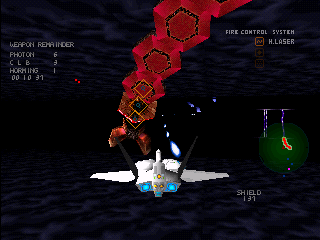 Each mission tasks you with destroying a particular target, usually a large creature or structure. To aid in your goal, you have a rapid fire laser, the ability to boost and strafe for additional mobility, and three different subweapons. The homing missile is self-explanatory, the photon is essentially a slower to ready but more powerful flurry of homing missiles and the “CLB” launches a spiral of lasers that can’t lock on to targets, but deals massive damage if you can get them all to hit your target. The Analog Joystick controller is compatible, though using it doesn’t make a significant difference. Death Wing is an incredibly lean game, only making you play three short missions before the comparatively lengthy final mission with no unlockables or extra modes. After each of the first two missions, you can select from two different paths, all of which offer unique targets, environments, and music.