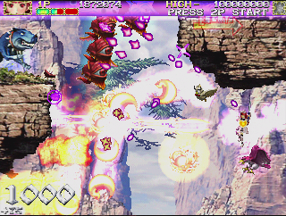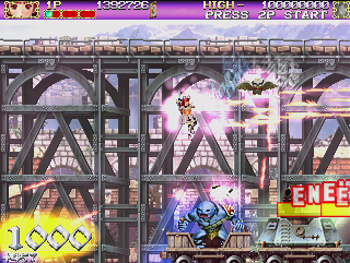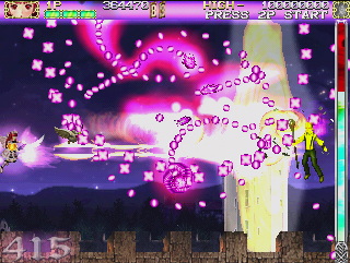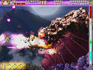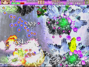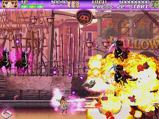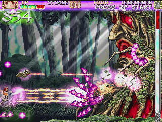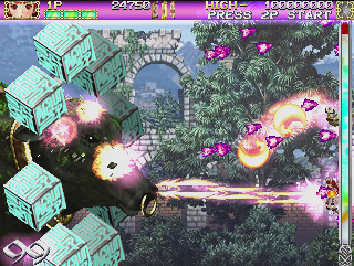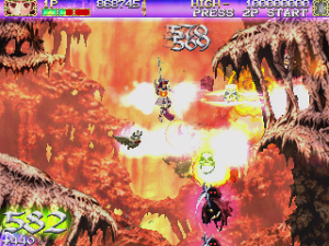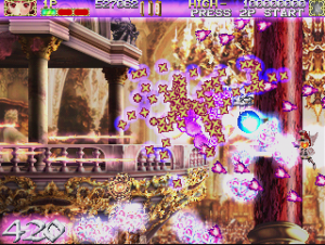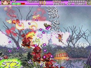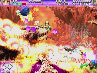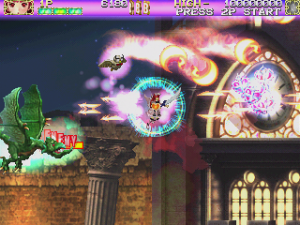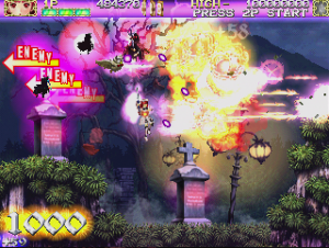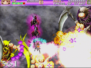 In an interview following the release of 2001’s Progear, Cave’s first “side-scrolling” danmaku project, lead programmer Tsuneki Ikeda (often referred to as “IKD”) opined that, in retrospect, horizontal shooters “aren’t really suitable for bullet-dodging” – this appeared to signal a permanent return to the company’s standard vertical screen orientation. A few years down the road, however, for his latest shoot-em-up IKD determined to revisit the sideways view after all, though with a different goal in mind: now intent on appealing to customers normally put off by “hardcore” shoot-em-ups, he pitched a concept for the game that later became Deathsmiles, one whose action was “busy” but “not a danmaku“, specifically instructing lead programmer Takashi Ichimura (who’d served in similar capacity on Dangun Feveron and Ketsui) to “get away from that Cave-like feel”.
