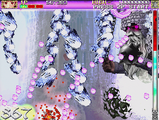 About a year after the game’s initial arcade release, as they’ve done on a handful of other occasions, Cave decided to release a small amount of “revised” Deathsmiles boards, on slightly upgraded “SH3b” hardware, under the title Deathsmiles Mega Black Label (because, of course, “regular” Black Label just wasn’t good enough). Based in part on a non-commercial board called Deathsmiles DIE, which was only ever playable at certain company events, in most respects it’s the same game, but there are a handful of additions catering mostly to devoted fans: Sakura is now a playable (and powerful) character, a new optional area (the “Ice Palace”) is selectable, players can “power-up” with as few as 500 items in stock, the “overall counter” is now displayed more clearly and does not reset upon powering down (though it does drain slowly between charges), and both an extra hidden final boss and an even crazier “Level 999” difficulty (because simply moving up to Level 4 just wouldn’t…aw, forget it) are available for the truly masochistic. Few people ever got to play “MBL” in its original form, though Cave would soon see fit to change that.