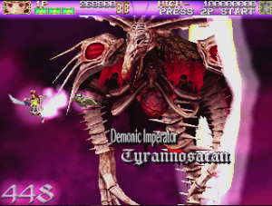 On the aural front, storied video game composer Manabu Namiki (whose hand is present in everything from Battle Garegga to Metal Slug to Trauma Center to Odin Sphere) capably completes the mood, spicing up the pipe organ flourishes and tinny strings you’d expect with catchy electronic accents – a handful of brief, spooky background voiceovers are also sprinkled in, including a semi-recognizable one sampled from 1966 exploitation film Mondo Keyhole. If you can reach the final boss, however (a friendly fellow named Tyrannosatan, because “regular” Satan just wouldn’t cut it), Namiki is content to step aside and allow Bach’s iconic Toccata and Fugue in D Minor to say all that needs be said of the encounter.
