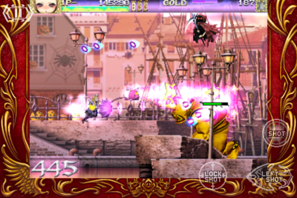 Four years after its debut Deathsmiles also earned itself an overdue translation to the iPhone and iPad, the third Cave arcade port to make the trip. The expected set of modes, namely a straight-up “Arcade” and an exclusive “iPhone” variation, are here, as are “Practice” settings to fine-tune your skills and compatibility with both OpenFeint and Game Center. Unlike its predecessors there’s no neutral “movement bar” area set aside for your finger to control character movement with, so it can be a bit trickier to keep your digits out of the way of the onscreen action, but the “button” layouts for attacks are a bit more user-friendly than they were in its predecessors. “Arcade” is pretty much what you’d expect, with a few adjustments: the Final and “EX” levels can now be played on easier difficulties, “power up” mode lasts longer, an “auto-bomb” is available, and the text translation has been (re-)redone.