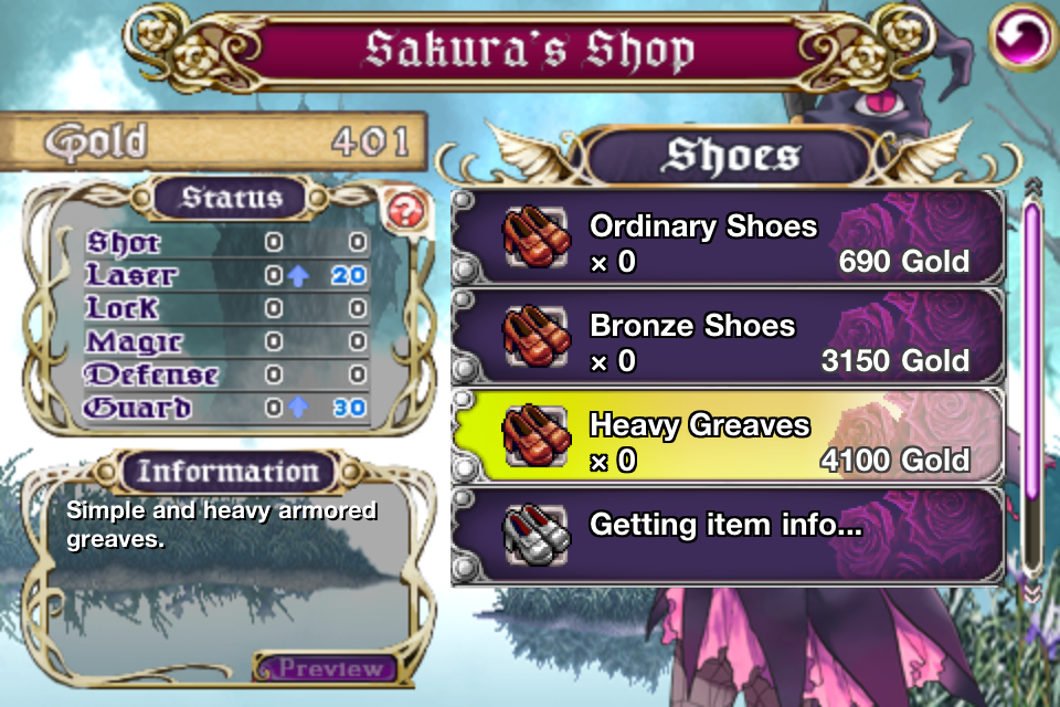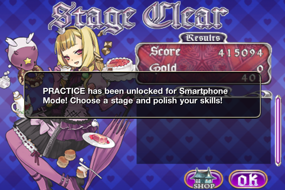 iPhone mode is another creature entirely: not only have both the character art (now rendered by mangaka Yukinatsu Mori) and soundtrack (remixed by Takeshi Miyamoto, AKA Kizakura) been given a new coat of paint, but an exclusive solo playable character, Tiara, has replaced the original cast (the latter make brief appearances, but aren’t selectable). Unlike the other girls, she can be outfitted with a wide variety of items to increase her stats (including “defense”, as the traditional three-life setup has been replaced by a health bar): this equipment can be obtained either as random drops from defeated enemies (including bosses, if you can “seal” them via a quick “match-the-pattern” sequence at the end of battle) or by spending the point items you collect at an inter-level shop. Stage layouts and enemy patterns are unchanged (though mid-sized enemies have been given visible health meters, which is nice), save for a new “True Last Boss” at the very end, but the higher challenge levels now need to be unlocked. While shoot-em-up purists tend to dislike this somewhat “grindy” aspect (especially since you can’t switch to a different character to change things up), others don’t mind the sense of progression, especially since better equipment is a prerequisite to survival farther in.