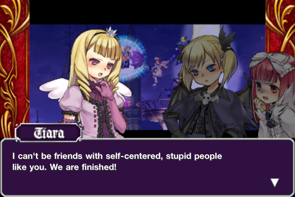 Not actually an “angel” at all, Tiara is a Gilverado native… the parasol-packing regal princess of the land, to be precise. Despite a tendency to come off as rather cold at first blush, she desperately wants to contribute to the fight against the evil forces invading her domain; unfortunately, unlike the angels, she has no magical abilities…until she happens upon a small, porcine creature named Mu, who ends up serving as her in-game attendant. Though her character “debuted” on a spinoff Drama CD (in which she searches for a way to gain the same powers as the angels’), she eventually garnered enough popularity to serve as the star of the portable edition’s “iPhone mode”.