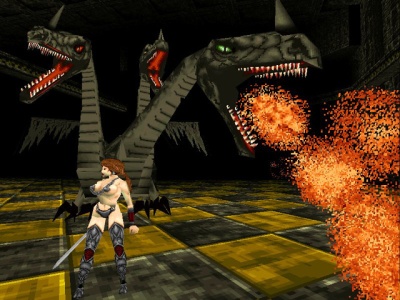 Only after the huge success of Tomb Raider people started paying attention to Eidos’ other 3D action game. Since it runs on a similar-looking 3D engine, Deathtrap Dungeon has often been dismissed as a cash-in on the success of Core’s hit franchise. This claim doesn’t quite hold water, given that the game was already in development when Lara Croft’s first adventure was still far from finished. The female protagonist on the other hand, the scantly clad assassin Red Lotus, was first introduced at a rather suspicious time in early 1997, mere months after the release of Tomb Raider. Her initial outfit included little more than a metal thong and a chain hanging around her neck to cover her nipples. Whether executive prudery prevailed in the end, or someone simply noticed how ridiculous it looked, she ended up with a somewhat more chaste leather leotard in the final game.