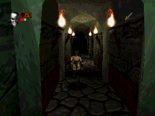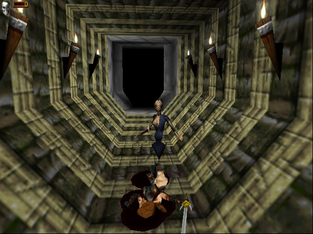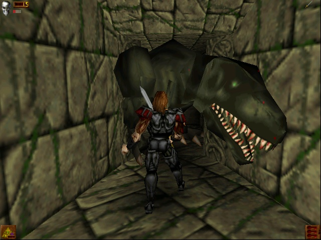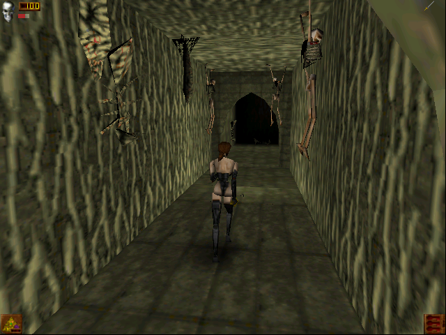 Outside of these rare occasions, the architecture lacks a certain sense of grandeur that makes games like Dark Souls so compelling more than a decade later. The book could convey that using the sheer power of words, but it would have costed much additional work and budget to realize graphically in 1998. The level design is by no means bland, even though it’s mostly just rooms and corridors and pits and switches and traps and monsters. Yet it cannot but disappoint to have interesting structures like the huge buddha statue entirely missing, especially since Tomb Raiderhad set the architectural bar high with the Sphinx and its huge Midas statue. Many non-standard encounters from the book are also left out, like the skeleton on the throne, which after all was prestigious enough to eventually replace the Bloodbeast on the book covers. Players could also briefly meet and interact with several other unlucky adventurers in the book, while all that’s left of them in the game are their bones.