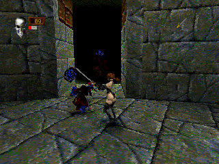 Domark first announced Deathtrap Dungeon the video game in early 1996, around the time it started merging into Eidos Interactive. It’s hard to find any Western sources that reported on the game at first, but it was relatively prominent in Korean magazines at the time. First screenshots still showed a blond protagonist of the usual gruffy hero type, but within few months he was replaced by the hard-bitten thug called Chaindog. (Blondie still makes a cameo appearance on the PlayStation as an adventurer turned to stone by the Medusa, though.)