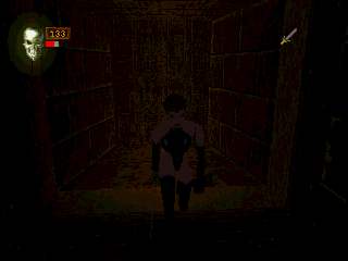 Although the game first came out for PlayStation, the primary platform for Deathtrap Dungeon was the PC, according to the in-game credits. But the PlayStation version was anything but a simple downscaled port. Naturally, it runs in low resolution and thus the texture quality isn’t as high, but it still manages to be aesthetically superior regardless. The lighting is more colorful and atmospheric, and the graphics just are on a higher artistic level than the PC textures. Those often seem too orderly and regular where the PlayStation version looks nasty, overgrown and dirty. The drawing distance is a bit shorter on the console, but the increased darkness only adds to the atmosphere.