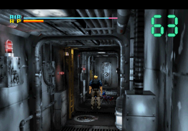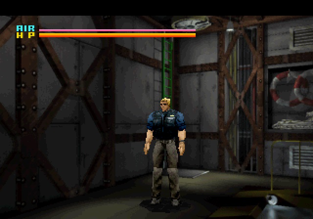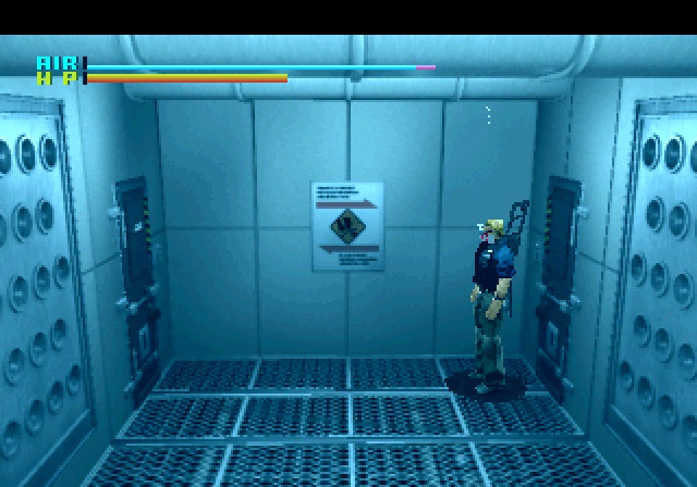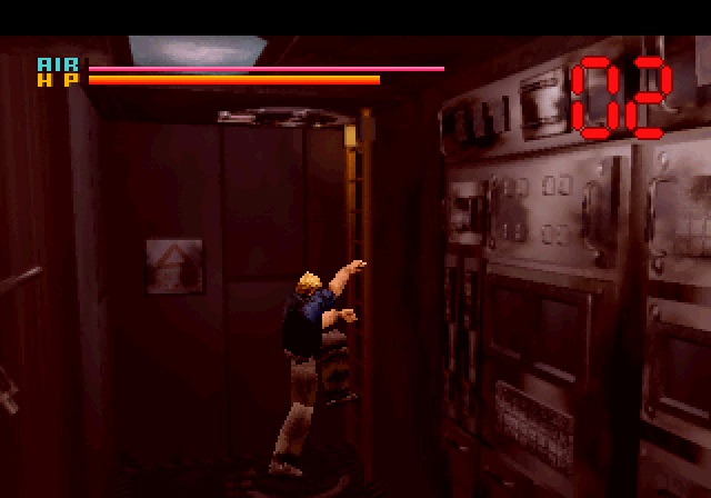 Deep Fear uses environmental hazards and air as a centerpiece for its horror. Air is a precious resource throughout the game and most rooms will have a countdown timer in the top right corner telling you how much air is left. This gives some segments of the game a sense of urgency as the player must decide if they’ll manage their few precious seconds fighting monsters or searching for a place to recharge their air supply. Unfortunately these environmental hazards aren’t utilized to their full effect. Being a survival horror game set at the bottom of the sea, you would think that the underwater segments would take more precedence in the game. Unfortunately, the underwater segments don’t really change much besides applying a light blue filter to the screen and making the character move twice as slow. In later portions of the game the player actually travels along the ocean bed in a giant deep sea suit called the Big Jim, but these portions of the game are brief.