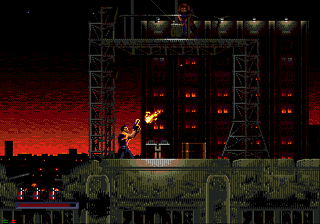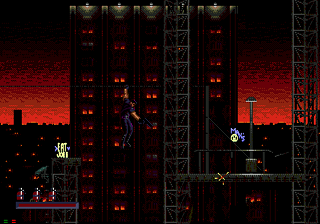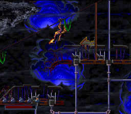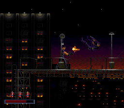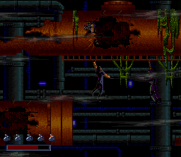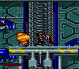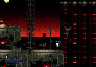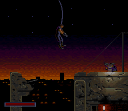 The stages are in Demolition Man are extremely dynamic. You’ll barely take more than a few steps on flat ground. There’s always obstacles and terrain of varying height jutting up in front of you, from electrical towers connected by ziplines to bungie-jumps off collapsing buildings. In one stage, you’ll track Phoenix through a complex network of pipes, and you’ll only be able to see yourself or Phoenix through small holes. In another stage, you’ll spend almost the entire time jumping from zipline to zipline through a huge cavern. The graphics during these sidescrolling segments are fairly pleasant. The mediocre spritework is made up for by some really incredible detail and expert use of shading and color. The music, while nothing to write home about, is catchy and keeps with the pace of the action. The Sega CD version actually has some really nice, ambient pieces (particularly Phoenix’s boss theme) that use voice samples from the movie.