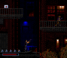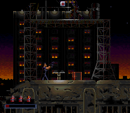 Fortunately, the version of Demolition Man that appeared on the more mainstream consoles wasn’t a port in any way of the 3DO version. Instead, this version was developed by a small house within Acclaim and takes a much more traditional approach by making the game a straightforward yet intense run ‘n gun shooter with the occasional overhead romp a la Contra III. You’ll run across the stages, shooting thugs and navigating the harsh terrain. The stages are really big and dynamic and have lots of nooks and crannies to explore. One particularly cool thing about the sidescrolling stages is how vertical they tend to be, with lots of climbing and ledge hopping to get to higher levels.