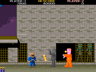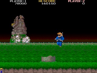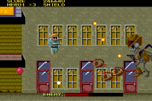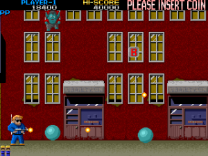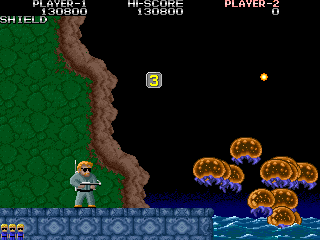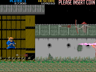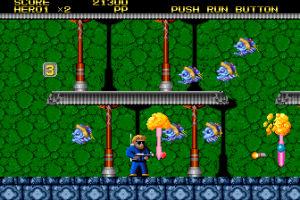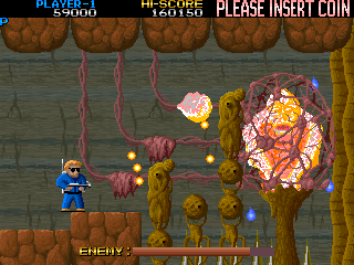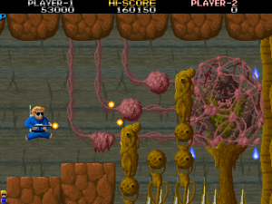 Floating power-up icons change your weapon to bombs, three-way shots, pink lasers, and a “V” which gives you an actual Ghostbusters-esque energy stream, albeit with average range. All weapons work best for different situations, but the three-way generally provides you with the most security to compensate for the inability to aim upward. The pink laser becomes useful in later areas where you’re forced through narrow corridors and power matters more than coverage, and the blue proton stream helps to clear a few segments that barrage you with weaker enemies. There’s not much reason to stick with the missiles and the bombs are almost worthless like the Ghosts ‘n Goblins torch, but weapon icons float over the screen frequently.