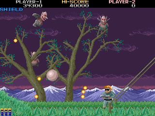 It’s a bizarre anachronism gumbo that defies the usually futuristic designs of Toaplan’s catalog, and some of the enemies are some of the cartooniest sprites they’ve ever created. This lends an interesting touch of personality, though it’s somewhat countered with fairly straightforward backgrounds and the occasional creepy skeleton boss fight. You’re avoiding boulders pushed by goblins one minute and fighting a floating corpse in Native American regalia the next. You also fight a samurai skeleton after dealing with a wave of those one-eyed Japanese umbrella demons. The tone can be a little bizarre to say the least.