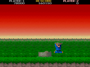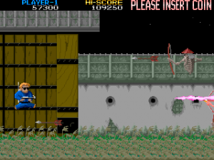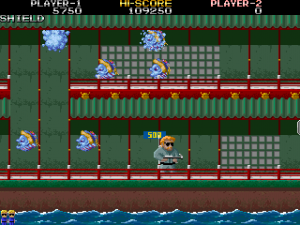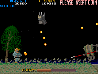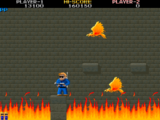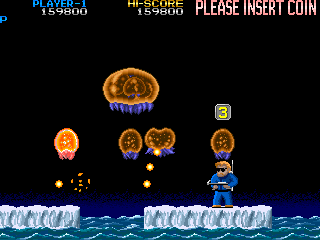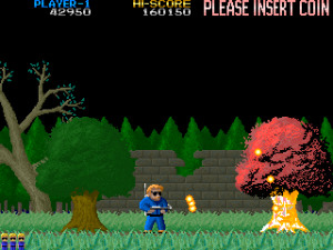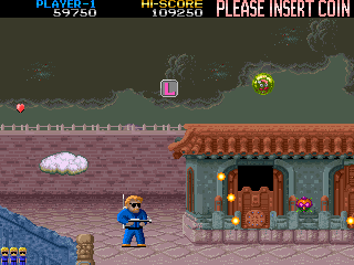 In contrast to Toaplan’s usually serious and futuristic designs, Demon’s World takes a more cartoony appearance with its characters. It’s not Contra in any sense except you’re holding a gun, and it has a bit more in common stylistically with Ghosts ‘n Goblins, but again, the choice of weapon indicates a somewhat more modern era. However, it never gets more modern than the first area town, and even the buildings look somewhat old-fashioned as if it were based on the Old West. After you clear it, you’re mostly wandering through forests, islands, Japanese villages, Chinese fantasy lands, and even a full-on castle as the final setpiece. You start with pink ghosts wearing nice hats and soon encounter the likes of gargoyles and Frankenstein’s creatures, but eventually take on possessed Japanese lanterns, jiangshis (Chinese hopping vampires), possessed suits of armor and whatever other Scooby-Doo costumes you can imagine.