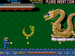 At least the difficulty remains consistent. Death sets you back to a checkpoint, but usually not much farther than three screens back. Your weapons don’t have any additional power levels, so you’re not any worse off in firepower if you have to continue. You can collect P-icons that allow you to take a hit if you grab three of them, but nothing more complex beyond that. As long as you’re persistent, Demon’s World feels beatable up until around when you fight the Chinese dragon boss (the first of three dragons, strangely enough).