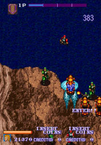 You get different objectives in each level which essentially equate to “reach the end of the level and blow up the boss.” You get four different weapons with which to do this: The machine gun, the flamethrower, the spread gun, and the comparatively rarer acid launcher. They can be powered up by finding P icons on the ground, and you also get a bomb meter which you can build by collecting medals. The more you collect, the more damaging your bomb blast is when you unleash. You also get a dash button that allows you to rush across the screen with a temporary window of invincibility, essentially acting as a dodge function. You’ll also occasionally find vehicles to help you, most of which are required like jet skis and snow machines; you also get an absolutely worthless and optional walker vehicle with an attack that barely hits enemies most of the time, but at least it takes damage for you! As per Mercs, you only have one lifebar that can be shredded rather quickly by all the tanks and big bosses you face, like the chopper at the end of the first level that you fight on a perpetually falling chunk of bridge. There are a few other awesome setpieces, like blowing everything up on a gigantic enemy aircraft and jumping all around its wings and cargo bays.
