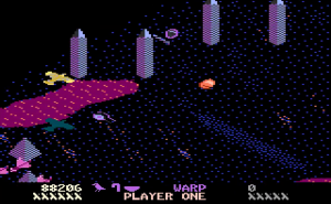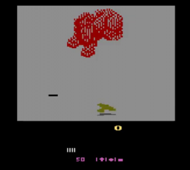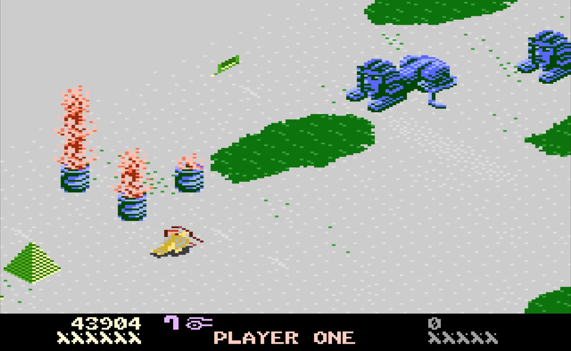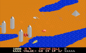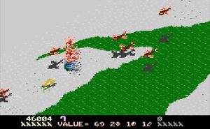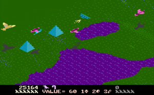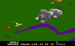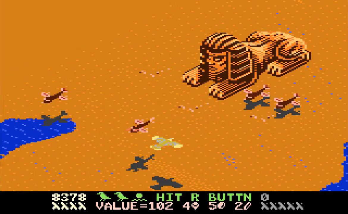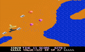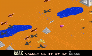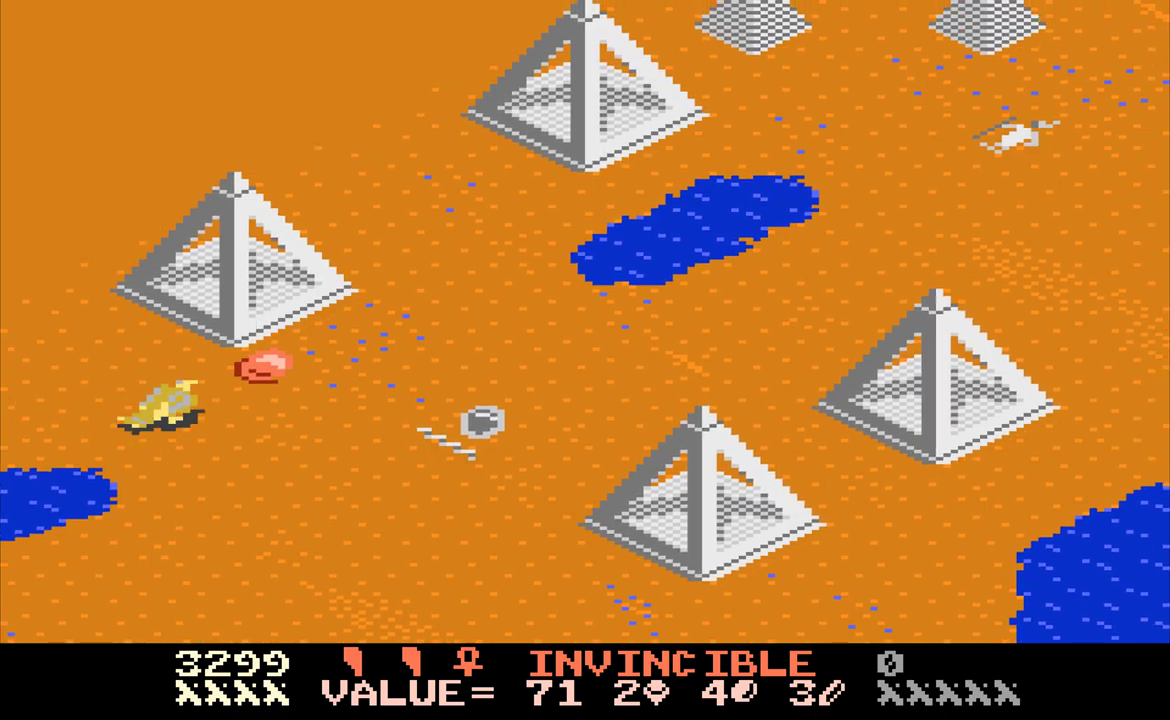 Desert Falcon can basically be described as “Zaxxon in the desert,” and while that’s not a completely inaccurate description, there are additional elements that set it apart from Zaxxon. You play as the Desert Falcon, on a quest to retrieve the Pharaoh’s lost treasures. Golden Eggs, Silver Ingots and Gems are scattered across the desert sands, along with various hieroglyphics, all of which can be picked up. Standing in your way are all sorts of flying and crawling enemies, as well as the enormous Howling Sphinx. You can hop, swim and fly, but you’re armed only with arrows. You can gain additional (temporary) powers, called Super Powers, by picking up the hieroglyphics. These powers are activated by pressing the second button on the 7800 controller. Each combination of three hieroglyphics gives you different powers. For example, pick up an Ankh, Bowl and Sun, and you might have the Invincibility Super Power. Get two Bowls and a Feather, and you’ll get points instead. On higher levels of difficulty, not all of the powers help you. Some, like Shackles and Broken Wing, will limit your abilities by hobbling the Falcon. Luckily, aside from points, the Super Powers don’t activate automatically. On top of that, the screen will show you the name of the Super Power you’ve collected, and if it’s one you don’t want, you can collect more hieroglyphics until you get one to your liking.