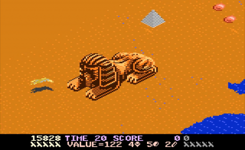 Desert Falcon can basically be described as “Zaxxon in the desert,” and while that’s not a completely inaccurate description, there are additional elements that set it apart from Zaxxon. You play as the Desert Falcon, on a quest to retrieve the Pharaoh’s lost treasures. Golden Eggs, Silver Ingots and Gems are scattered across the desert sands, along with various hieroglyphics, all of which can be picked up. Standing in your way are all sorts of flying and crawling enemies, as well as the enormous Howling Sphinx. You can hop, swim and fly, but you’re armed only with arrows. You can gain additional (temporary) powers, called Super Powers, by picking up the hieroglyphics. These powers are activated by pressing the second button on the 7800 controller. Each combination of three hieroglyphics gives you different powers. For example, pick up an Ankh, Bowl and Sun, and you might have the Invincibility Super Power. Get two Bowls and a Feather, and you’ll get points instead. On higher levels of difficulty, not all of the powers help you. Some, like Shackles and Broken Wing, will limit your abilities by hobbling the Falcon. Luckily, aside from points, the Super Powers don’t activate automatically. On top of that, the screen will show you the name of the Super Power you’ve collected, and if it’s one you don’t want, you can collect more hieroglyphics until you get one to your liking.