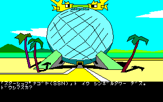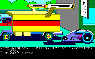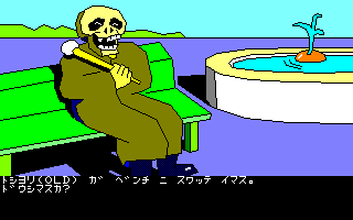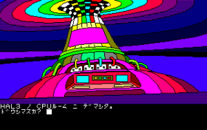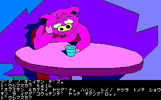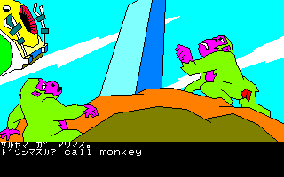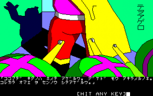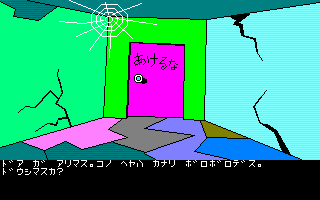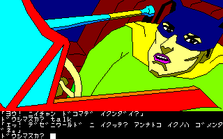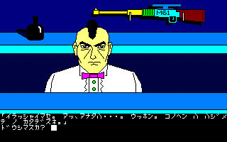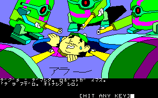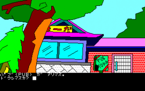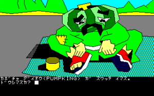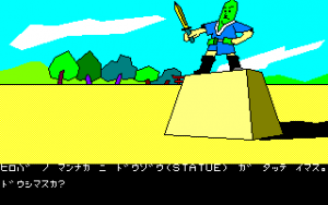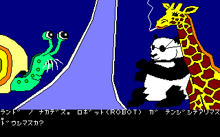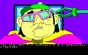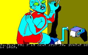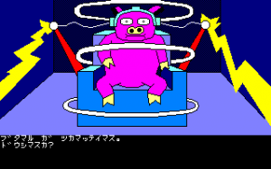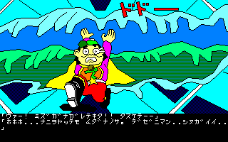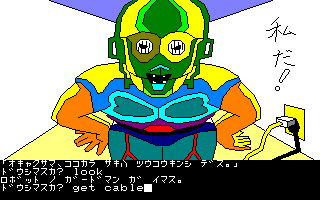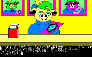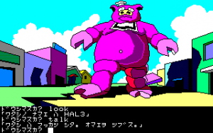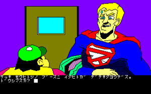 There’s also a bit of music, playing a few bars from the famous melodies associated with the characters you meet (the theme from the Richard Donner Superman movies, the 60s Batman TV show song, and so forth.) The game was also packaged with an audio tape with several songs, all painfully 80s, including themes for Dezeni World, Butamaru, HAL3, and, of course, Dezeniman himself. The interface is the same, although the vocabulary isn’t as rough, and it’s quite a bit easier in general, with less “run around and find the object that fits in this slot”-type puzzles. With a slightly more driving plot, however silly, it also elevates itself above the mere “treasure hunt” quests that comprised so many text adventures of the era.