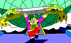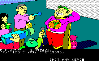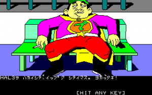 “Warning: For Crazy People Only” proclaims a sticker on the cover of Dezeni World, a more insane take on the whole theme park treasure hunt theme established by Hudson two years before. This time the player is put in the role of an onscreen character – Dezeni Man, a fat disheveled loser who bears some kind of resemblance to Hudson spokesperson Toshiyuki Takahashi (also known as Meijin Takahashi, who was also the main character of their Adventure Island series, although he denies the connection.) His goal – to infiltrate Dezeni World and disable the evil computer HAL3 (a parody of the HAL 9000 from 2001: A Space Odyssey, although in Japanese it’s pronounced “harumi”, a girl’s name.)