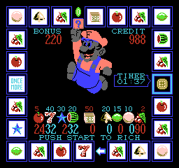 That’s right. The silliest bit being that Start isn’t the button you’re actually supposed to push. The best thing to do is mash A so you get as many coins out of the brick block as you can before the timer runs out. The possibility of pushing Start to rich remains Diànshì Mǎlì‘s most celebrated mechanic, as this short-lived moment is the only time where you feel like that noisy mess of a digital slot machine actually requires you to be more than a brainless sloth sitting in front of his screen.