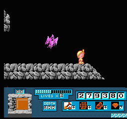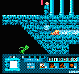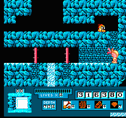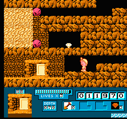 The only way to gain extra lives is to complete the mini-game at the end of each stage where Digger has to pick up every goblet in a very short amount of time, still having to avoid the falling boulders. If he manages to reach the exit in a short enough time (there are also several shortcuts and fake walls in the levels), there will be a couple diamonds among the goblets as well. You’ll need the extra lives since there’s no continues or passwords to return to the cave you’ve reached, unless you use a cheat code.