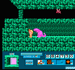 Basically Digger is a platformer which is somewhat like the lovechild of Boulder Dash and Spelunker: just like in the former, Digger must travel through a series of caves by excavating with his shovel through terrain in order to pick up diamonds, while trying not to displace boulders and get crushed by them or cause cave-ins. Falling from a height stuns and causes damage to Digger, who is weak like the Spelunker dude and has to find and deploy ladders in order to not lose one of his three starting lives if he falls down too much. There’s also the risk of getting caught in the blast radius of the dynamite bundles he can use to destroy certain walls, and numerous enemies roaming the caves, from giant mosquitoes to stronger foes like bone-throwing skeletons, invincible ghosts and cavemen with clubs the deeper Digger, well, digs towards the fabled Lost City.