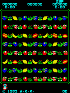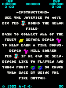 You take the role of “Big Ted”, a koala placed in the middle of a single screen, fruit-filled garden. Your goal is to wander around and collect all the fruit, after which you’ll do it again. Opposing you are multiple pink creatures, ostensibly the titular dingoes, who’ll kill you on contact. By pressing the single button the game offers you, however, you’ll throw a fruit in the direction you’re moving. Care needs to be taken, however, as you can only hold one fruit at a time, no matter how many you collect in a row. You’ll also need to stay out of a dingo’s line of sight as much as you can, as they can toss fruit and take you out that way, as well.