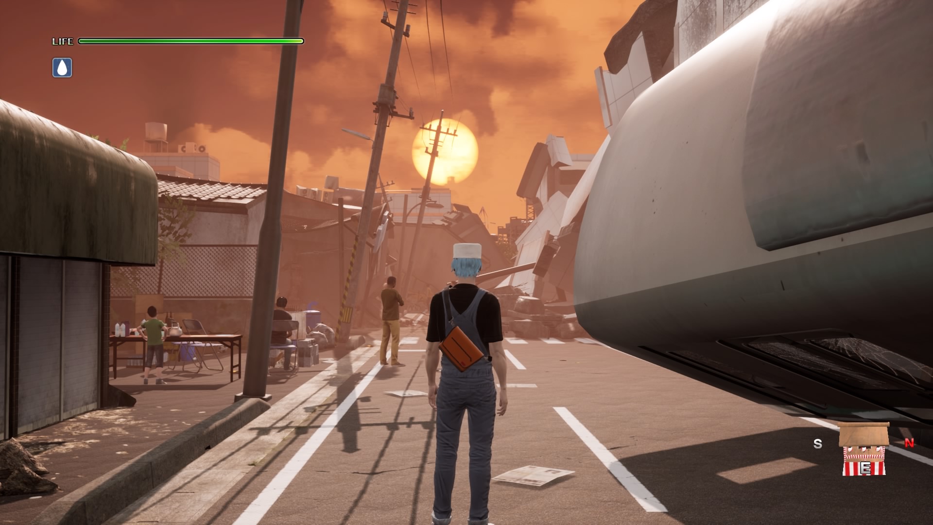 Despite being pieced together from the concept stage in 2010 and a development cycle between 2015 and 2018, the game is not dated so much as it exists outside of the traditional video game landscape. The game is not open world but allows you to wander between hub worlds at a leisurely pace chatting up dejected NPCs and completing sidequests that are mostly contingent on finding supplies or helping civilians get out of precarious buildings. The division of the game’s environment into sequential hub worlds separated by loading screens does hinder immersion. However, walking around the ravaged environments, no matter how enclosed they ultimately are, captures a gloomy tranquility well equipped to playing absent-mindedly at night. Disaster Report 4‘s preoccupation with meandering exploration creates a uniquely soothing atmosphere further distinguished by a variety of quirks.