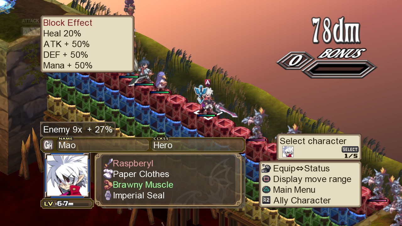 The Geo Stones have been replaced with Geo Blocks. Although they basically function the same way, they can be picked up as long as they’re not connected to blocks of the same color. If you pick up a Geo Block and toss it on another Geo Block of the same color, you’ll destroy all of them that are connected, damaging anything that’s standing on top of them. There are also more throwable items on the battlefield, including exploding barrels. Also new is the Magichange option. Monsters can be transformed into a super powerful weapon and can be wielded by any human in the same club. However, it only lasts for a couple of turns, and the monster is sacrificed for the rest of the battle. New units include a cheerleader, and a Masked Hero, who dresses like a Prinny-style superhero.