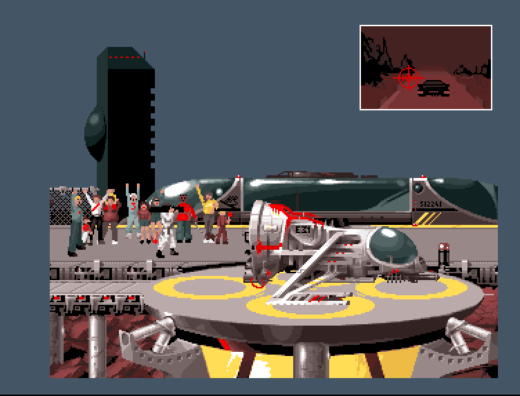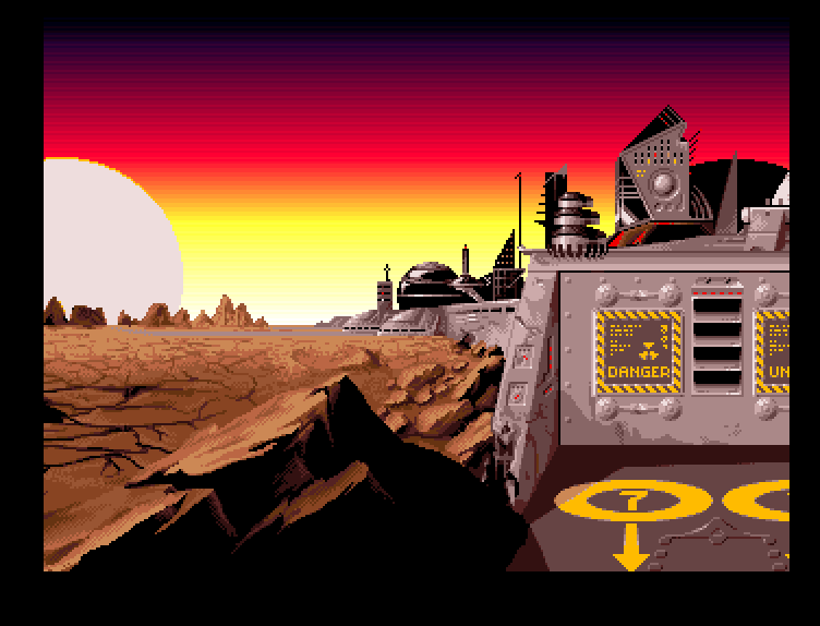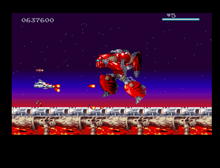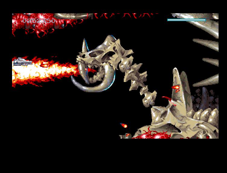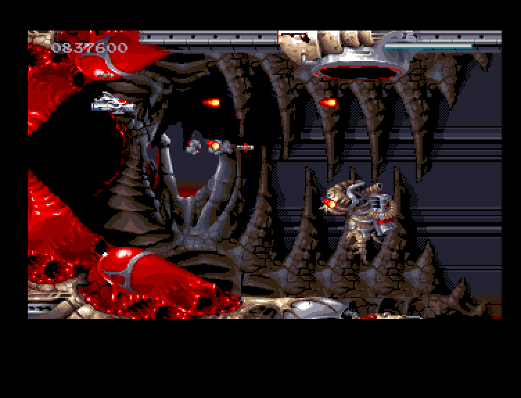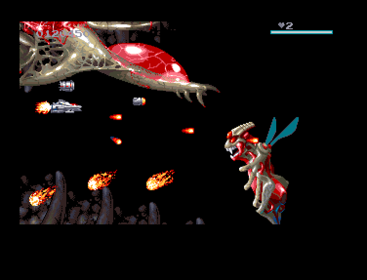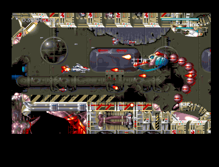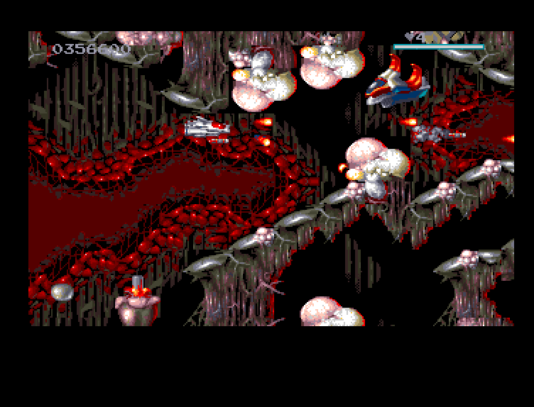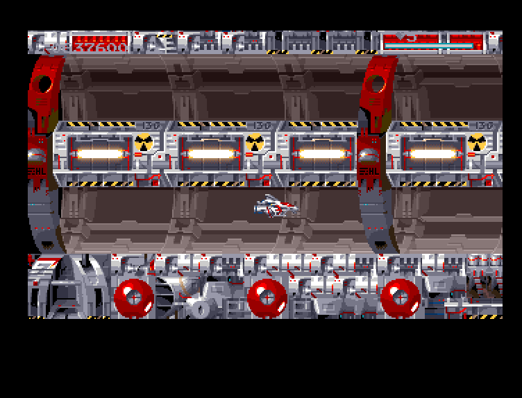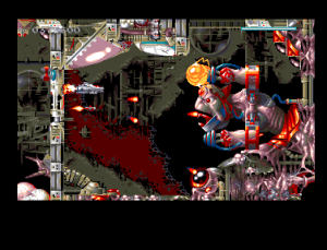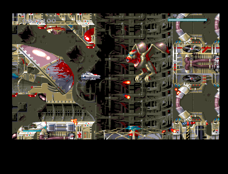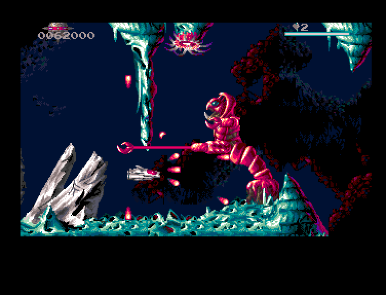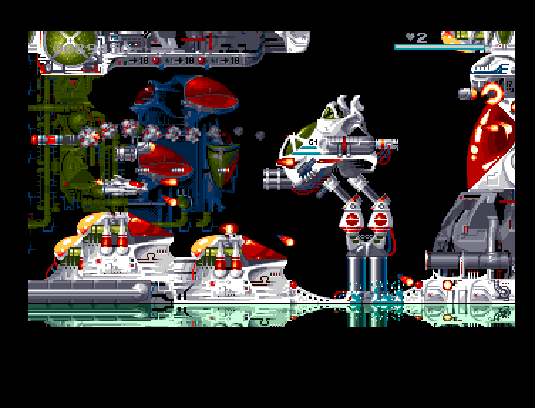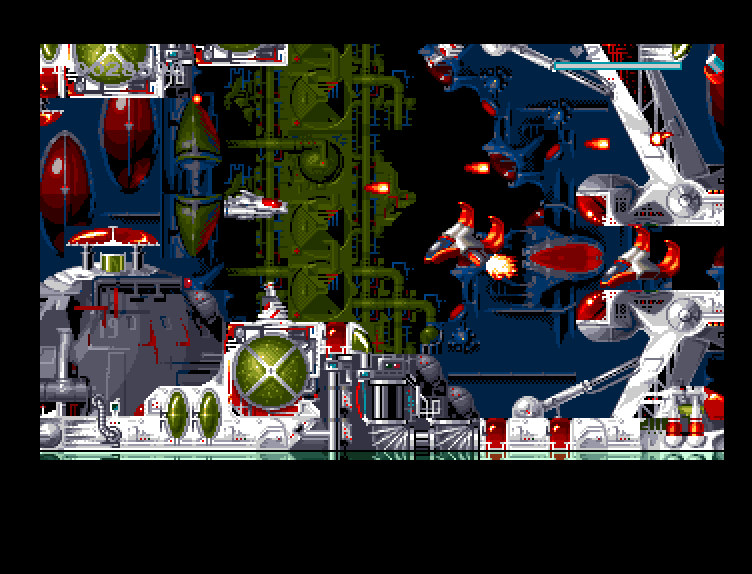 The evocative pixel-art is enhanced by very fluid sprite and background animations and various kinds of graphical effects. In the first level flying low over water rewards the player with delightful ship reflections, and when various huge mechanical walkers tramp their way across the screen, each footstep is marked with water splashes. It is the abundance of small details, like rotating fans or pulsating alien hearts which bring the game to life. The team went to great lengths to achieve these effects and used an anatomic book to get the best-looking animations for walking enemies. Programmer Mario van Zeist recalls to he constantly challenged himself to display as many effects on screen as possible, aiming for a maximum CPU and graphics co-processor load at all times while maintaining 50 frames per second.
