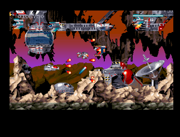 The game’s power-up system is worthy of note. Rather than simply picking up new weapons you collect blueprints for a total of a staggering 32 different weapons as well as upgrades to the maximum amount of power your ship can unleash at a time. Once you reach a power-up bay, which are scattered through the levels, you can add or remove weapons so as to maximize your attack capabilities. The arsenal is solid and includes horizontal, diagonal and vertical lasers, various types rockets, bombs, a shield and a turret which auto-targets enemies. Mario van Zeist remembers he programmed the weapon combinations in such a way that the hardware could always handle the graphical load without slowdown. Later in the game, a second ship becomes available to the player.