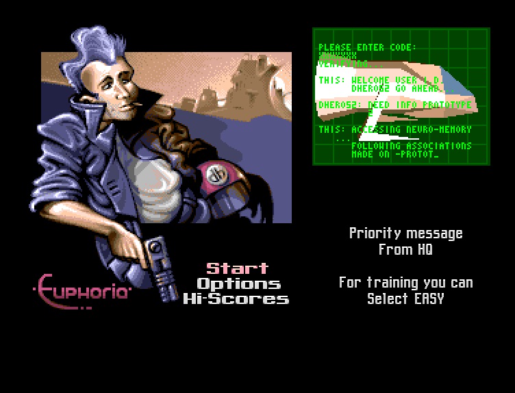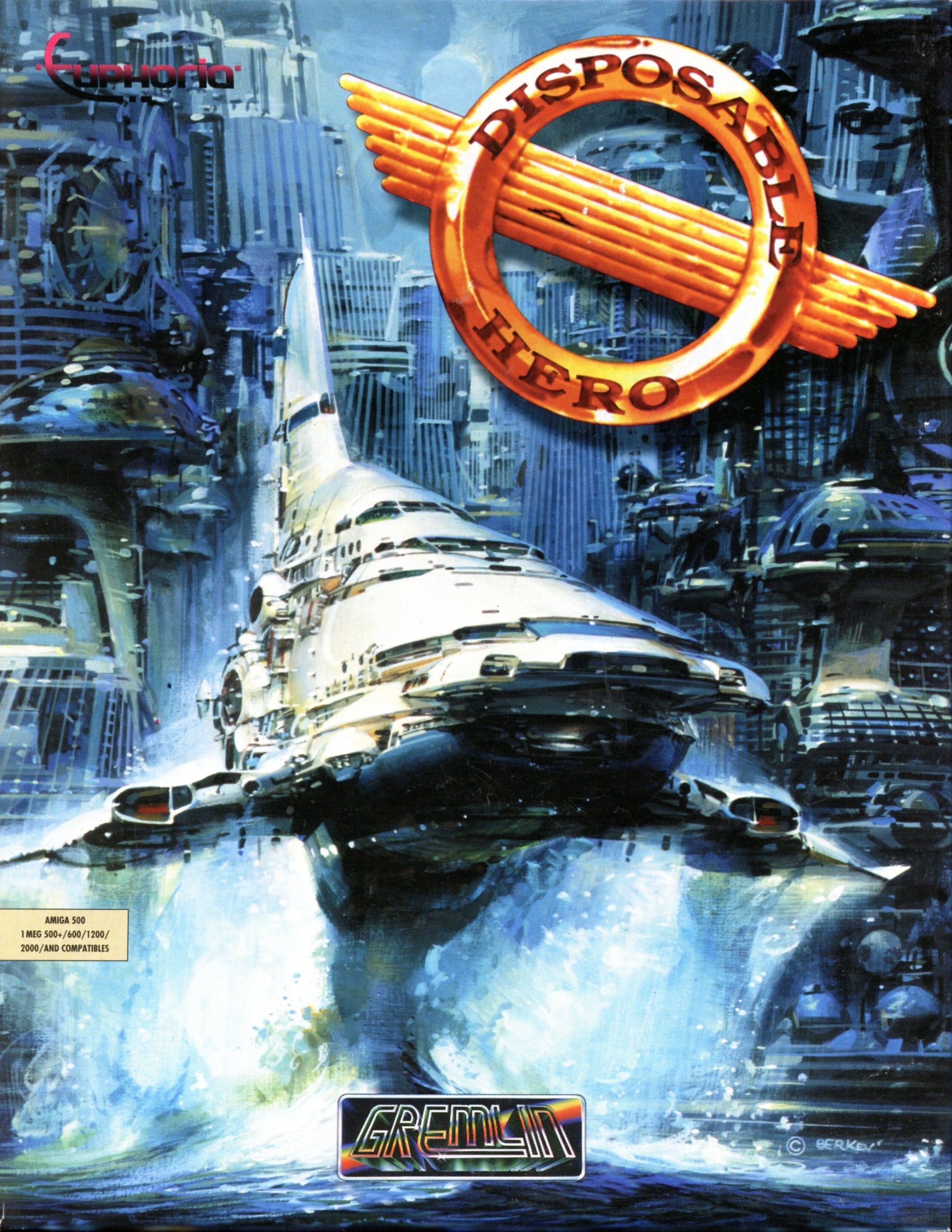 Disposable Hero features fantastic box art depicting a space ship hovering over water against the backdrop of a futuristic city. It was painted by American artist John Berkey, famous for painting book covers and movie posters for films like Star Wars, King Kong and Star Trek: The Motion Picture. After the team stumbled across this particular painting, they contacted Berkey who agreed to send a projector slide with the image to the Netherlands. Using borrowed equipment, the team scanned the image and the resulting file size was so incredibly huge (for the time) that it took nearly 15 minutes to load into Photoshop. Afterwards, the logo of Disposable Hero, heavily “inspired” by the logo of the 1992 World of Amiga computer expo, was superimposed on the painting.