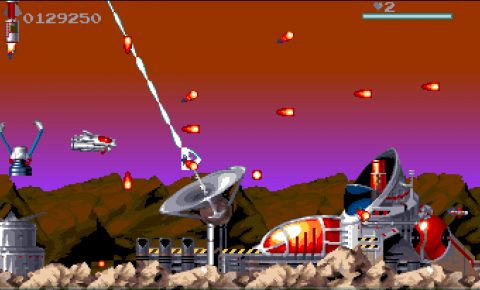 The game’s power-up system is worthy of note. Rather than simply picking up new weapons you collect blueprints for a total of a staggering 32 different weapons as well as upgrades to the maximum amount of power your ship can unleash at a time. Once you reach a power-up bay, which are scattered through the levels, you can add or remove weapons so as to maximize your attack capabilities. The arsenal is solid and includes horizontal, diagonal and vertical lasers, various types rockets, bombs, a shield and a turret which auto-targets enemies. Mario van Zeist remembers he programmed the weapon combinations in such a way that the hardware could always handle the graphical load without slowdown. Later in the game, a second ship becomes available to the player.