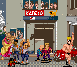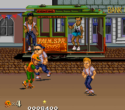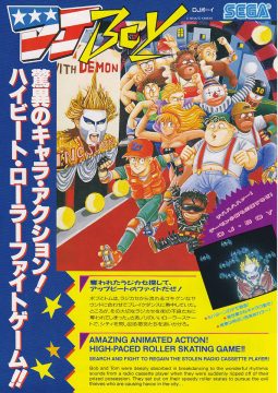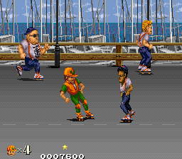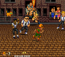 You control Bob (or Tom if you’re the second player) on a quest to retrieve his stolen boombox from roller skating hoodlums. It’s unique in that it doesn’t look like a typical Japanese game – rather, it’s a Japanese company attempting to create something in an American style. Heavily influenced by 80s B-Boy culture, the game features large, colorful sprites for the time, and has a ton of character. The art-style is similar to Kageki, a 2D fighter Kaneko developed for Taito in 1988. There’s also a pro-wrestling influence – you’ll often take a German suplex or piledriver, accompanied by crowd noise.