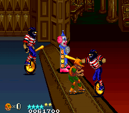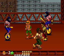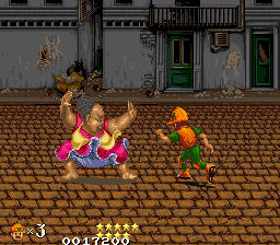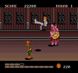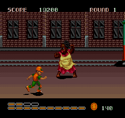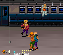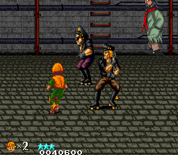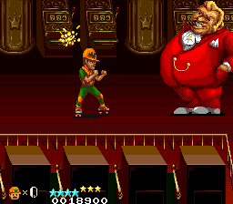 The Western versions change a few things. The Big Mama stereotype now has pink skin, and throws cream pies instead of passing wind, and the ninja final boss version now has lightened skin. The promenade has been replaced with a more urban looking street, the background and enemies of the subway stage are different, and bowling balls and a restricted field of view have been added, which up the difficulty. The casino stage is now auto-scrolling, and the boss rush starts in a sewer before taking you to a back alley wrestling ring,